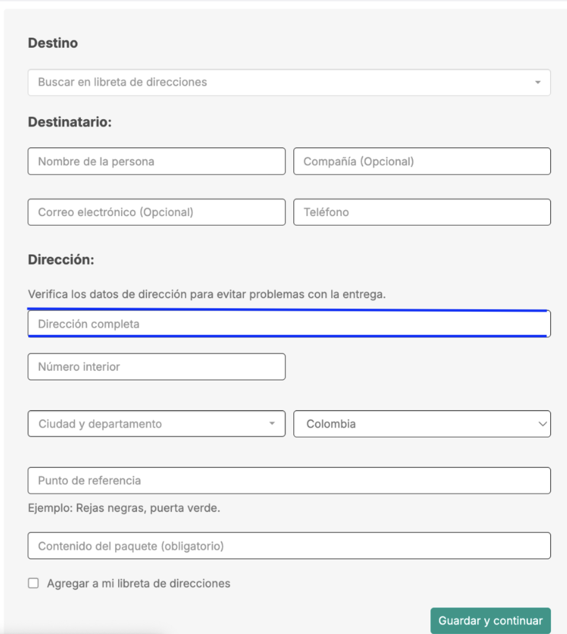 - Primero, crea tu envío. Para ello, es importante que al completar los datos de destino, escribas “Reclame en oficina” más la dirección en el campo «Dirección completa» y sigue con el llenado de los demás campos de la sucursal donde tu cliente podrá recoger el paquete.